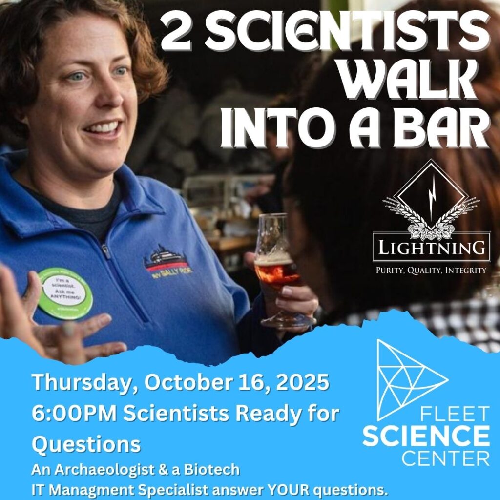 Science is in your everyday life, so make it a part of your social life! Two Scientists Walk Into a Bar takes place at different bars and breweries across San Diego County, making it easier to quench your thirst for knowledge and drinks all in one go. Come by Lightning to meet an archaeologist and a biotech IT manager. What do you want to know about the bones beneath San Diego real estate or navigating the regulated, complex world of biotech. Ask them!